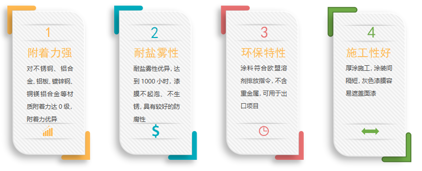 该底漆为双组份防腐涂料,专用于镀锌板、铝合金、不锈钢、钛金属等轻金属特殊底材,普通底漆对于该类基材附着力差,非常容易起皮脱落,环氧底漆涂装与该类金属粘付性牢固,配套防护或装饰面漆,达到较好的涂装效果。